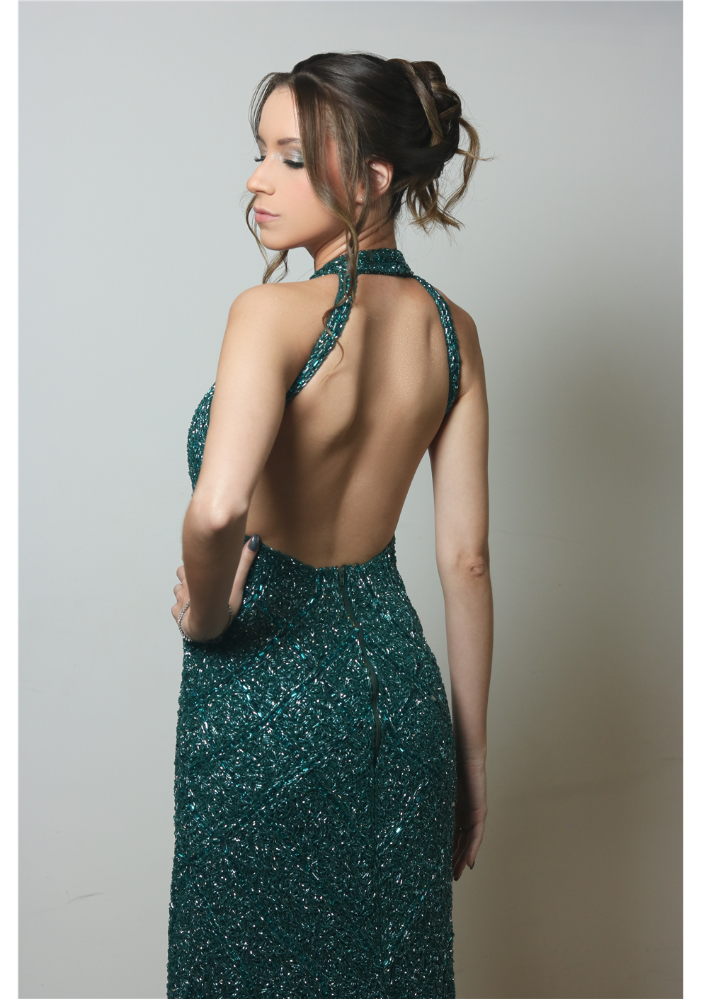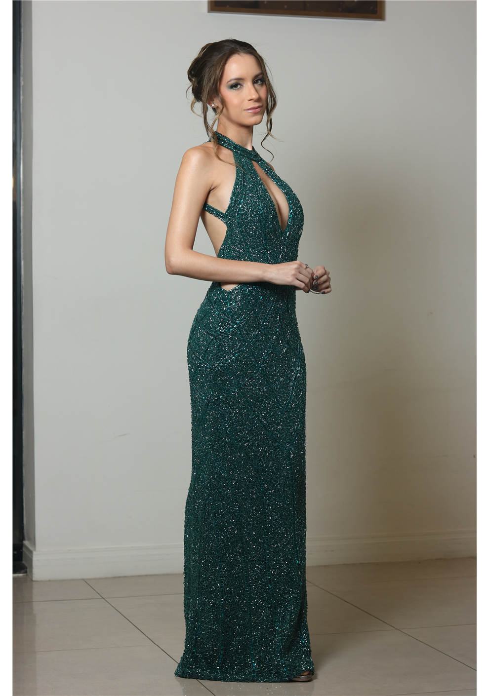 Vestido exclusivo bordado a mão em vidrilhos e cristais. Modelagem reta, decotes e fendas que valorizam a silhueta.