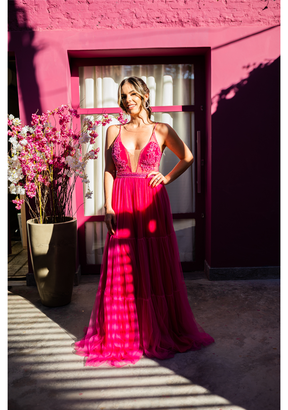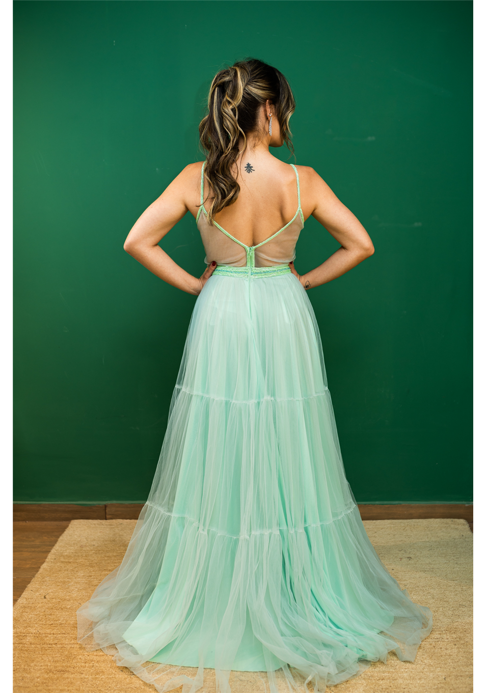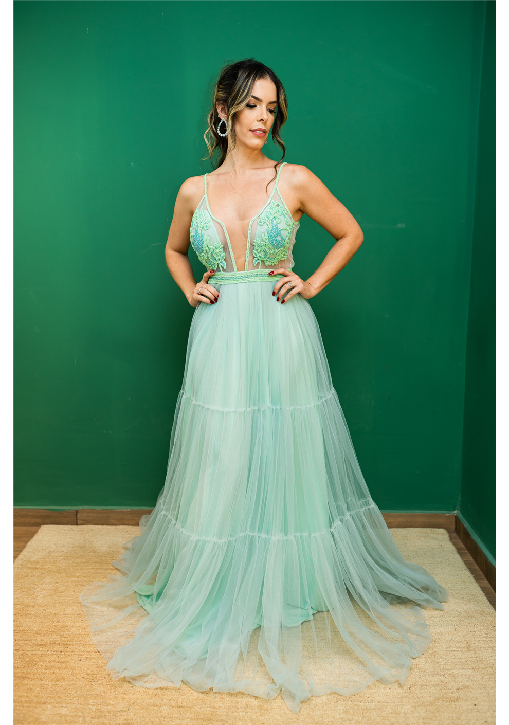 Vestido com saia de tule, com bordado delicado no corpinho. Romântico na medida!