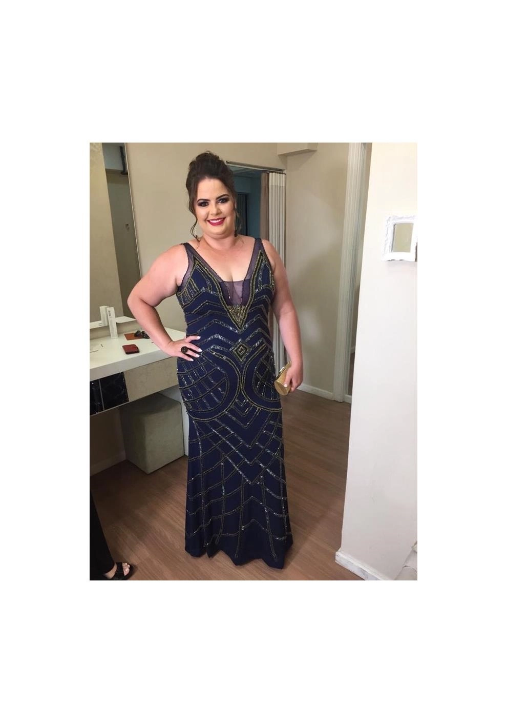Vestido azul marinho com bordado dourado e decote profundo com detalhe em tule frente e costas.